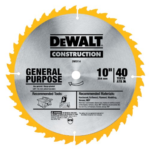 The DEWALT DW3114 Series 20 10-Inch 40 tooth ATB thin kerf saw blade with 5/8-inch arbor takes care of even the toughest jobs with ease. The thin kerf design ensures a smooth, fast cutting action, and DEWALT's computer-balanced plate reduces vibration for a more precise and accurate cut. This 40-tooth general purpose blade will handle hardwood, softwood, plywood, and molding with exceptional accuracy thanks to its exclusive wedge shoulder design that puts more steel behind each tip. [else][endif] [if